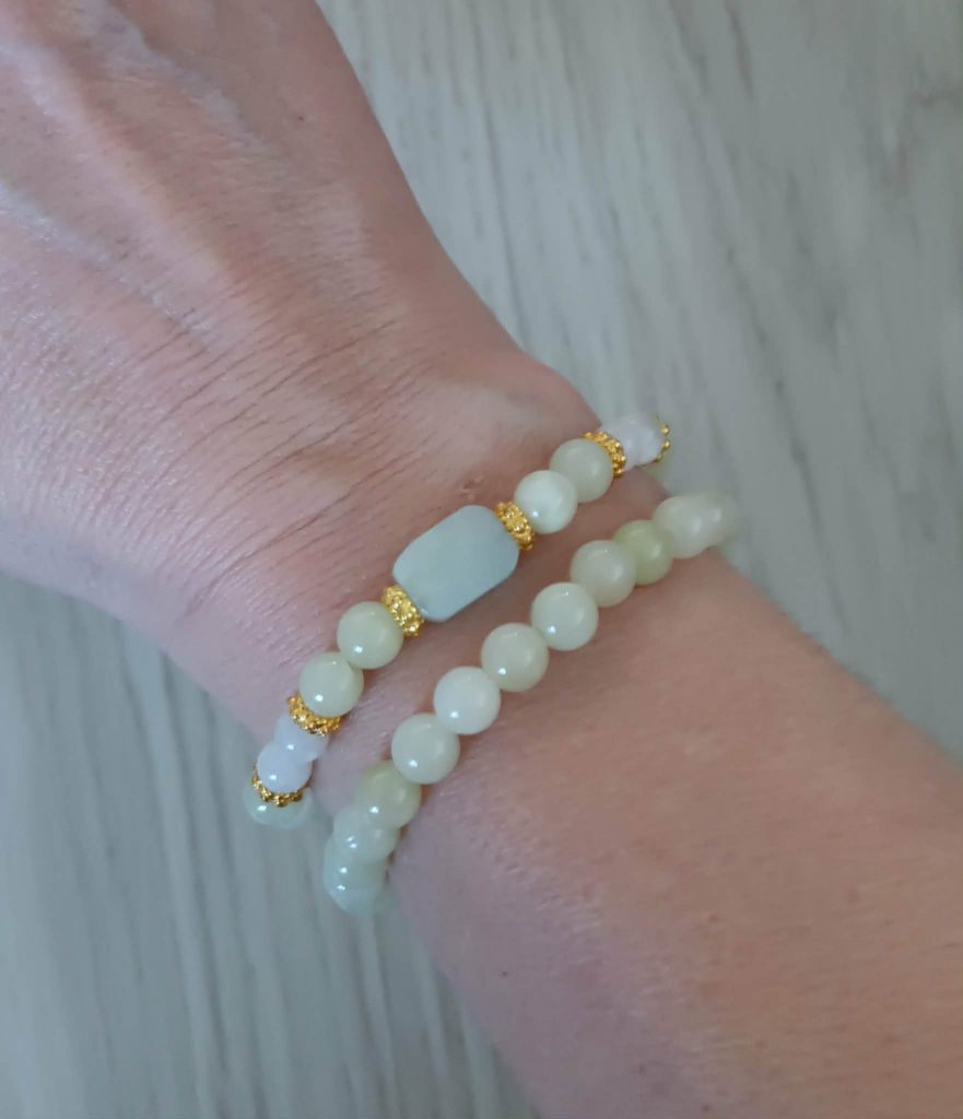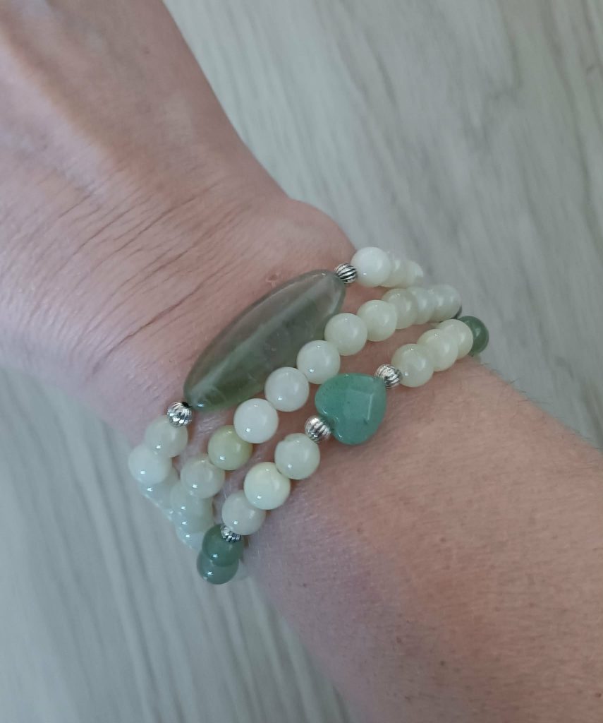 Olika kombinationer med grön Jade. Aventurin lång platta. Amazonit liten platta och den har ett par Månsten också.