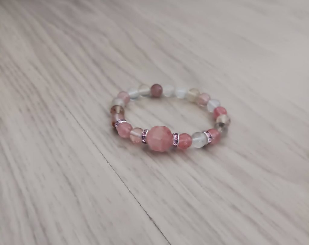 Vit Månsten med Jordgubbskvarts cylinder och några Jade i ljungrosa